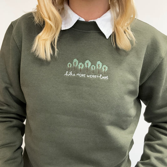 Embroidered Signature Sweatshirt - Hike More, Worry Less - Olive Green