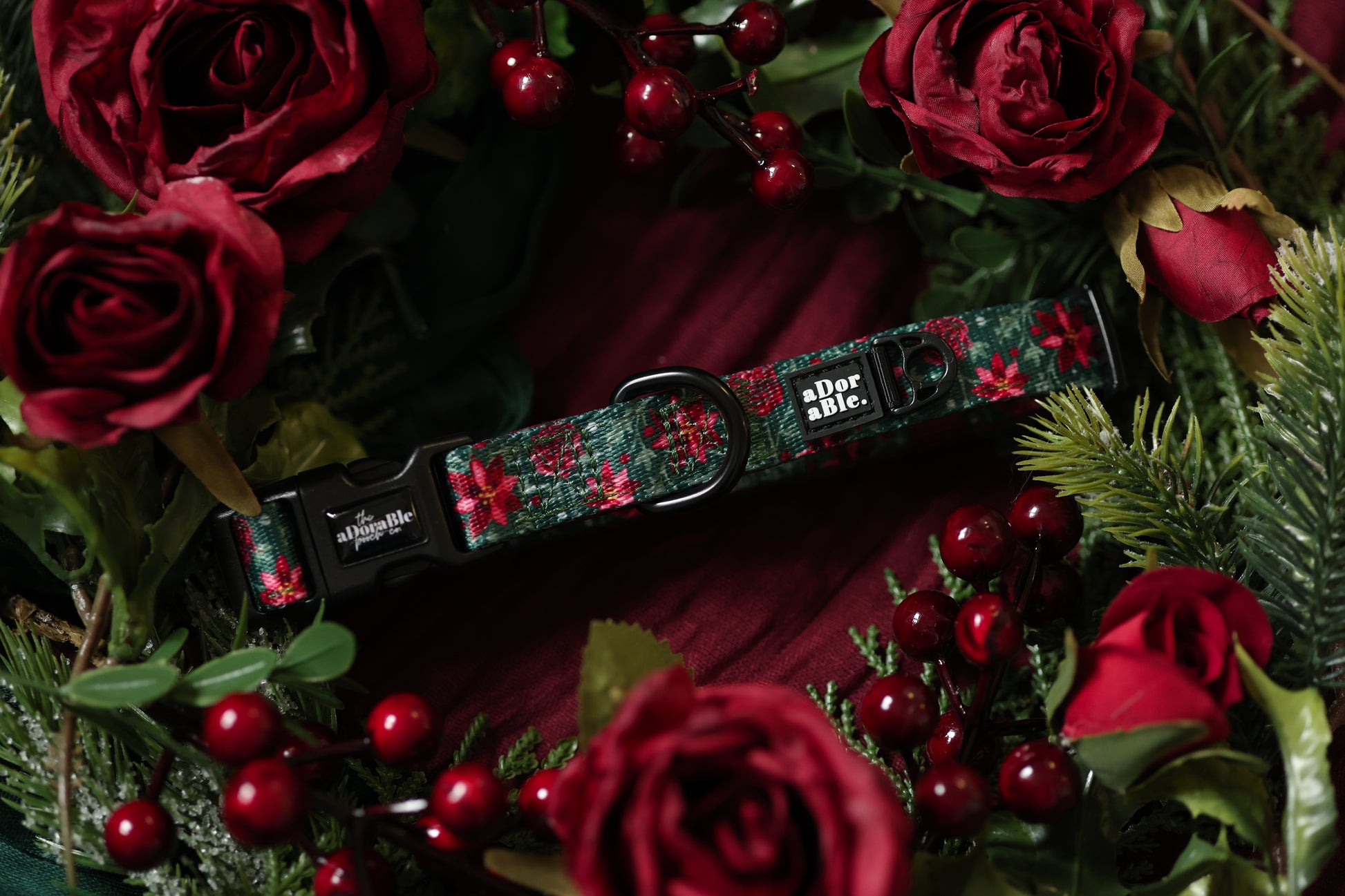 This beautiful design is filled with intertwining holly and trailing ivy complimented with deep red ditsy roses and poinsettias to create a collection that feels feminine, romantic and beautifully layered. Set against a deep green background, each hand-painted floral was designed to feel rich, elegant and quietly festive.