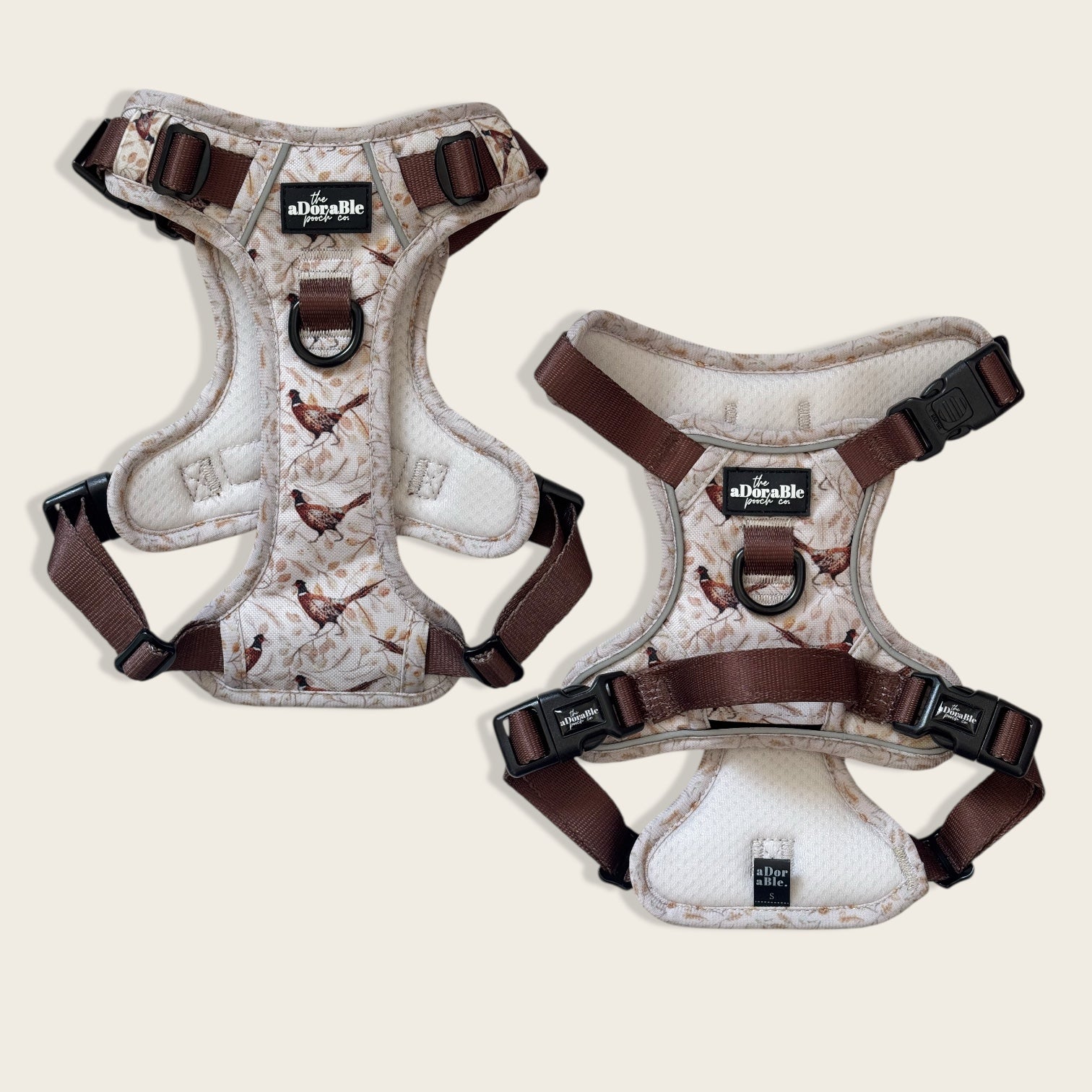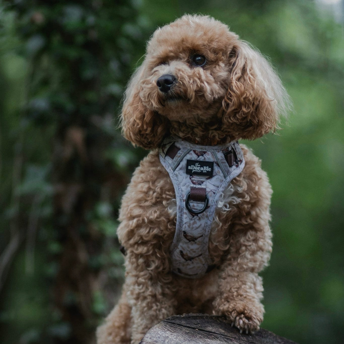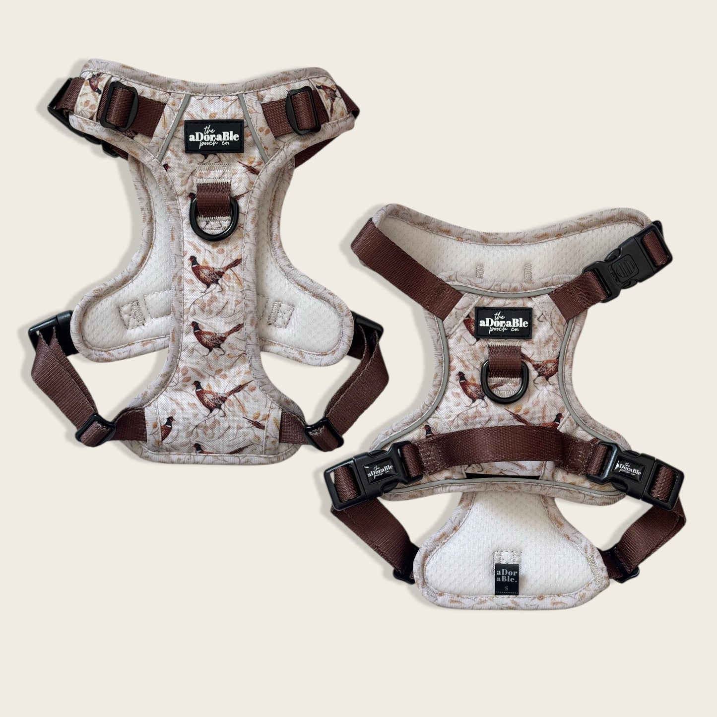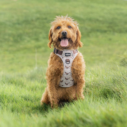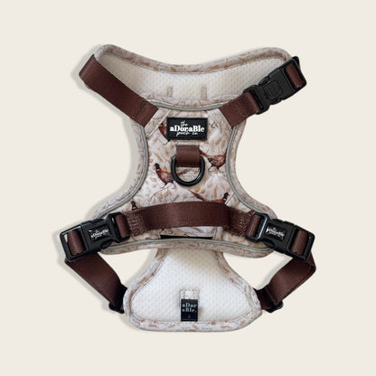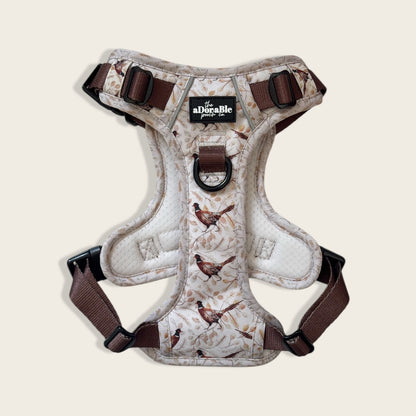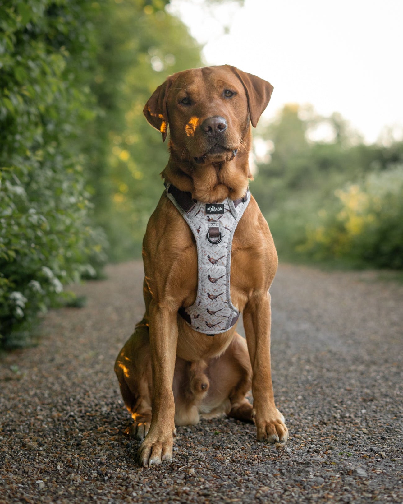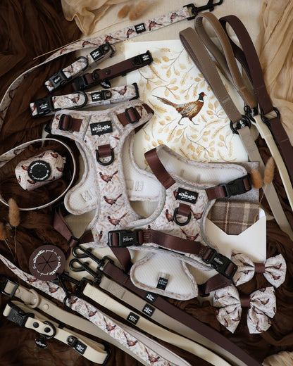 Set on a neutral beige background with subtle wheat field details, paired with rich, dark brown straps that harmonise beautifully with the hand-painted pheasant design. Every harness has been carefully designed with placement in mind, so each pheasant sits perfectly centred, adding just the right amount of detail. If you love hiking with your pooch, this collection is definitely for you!