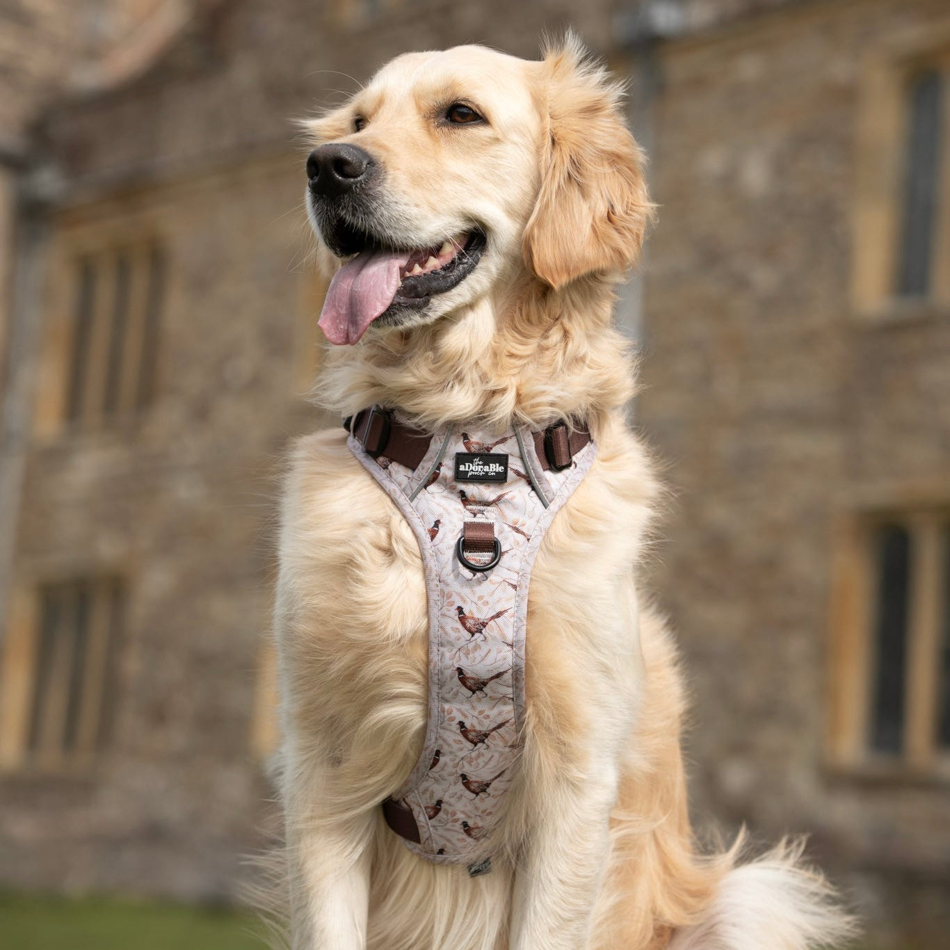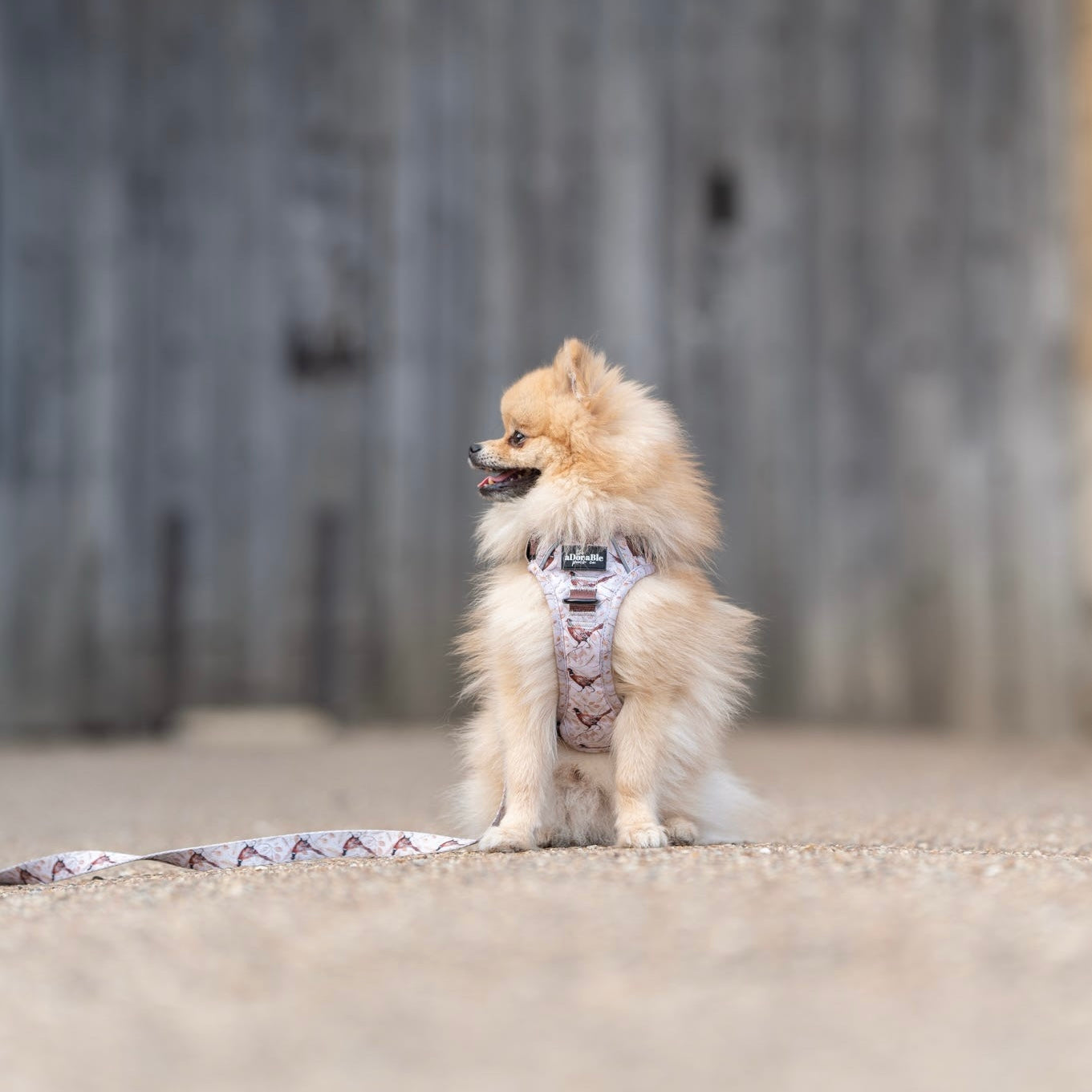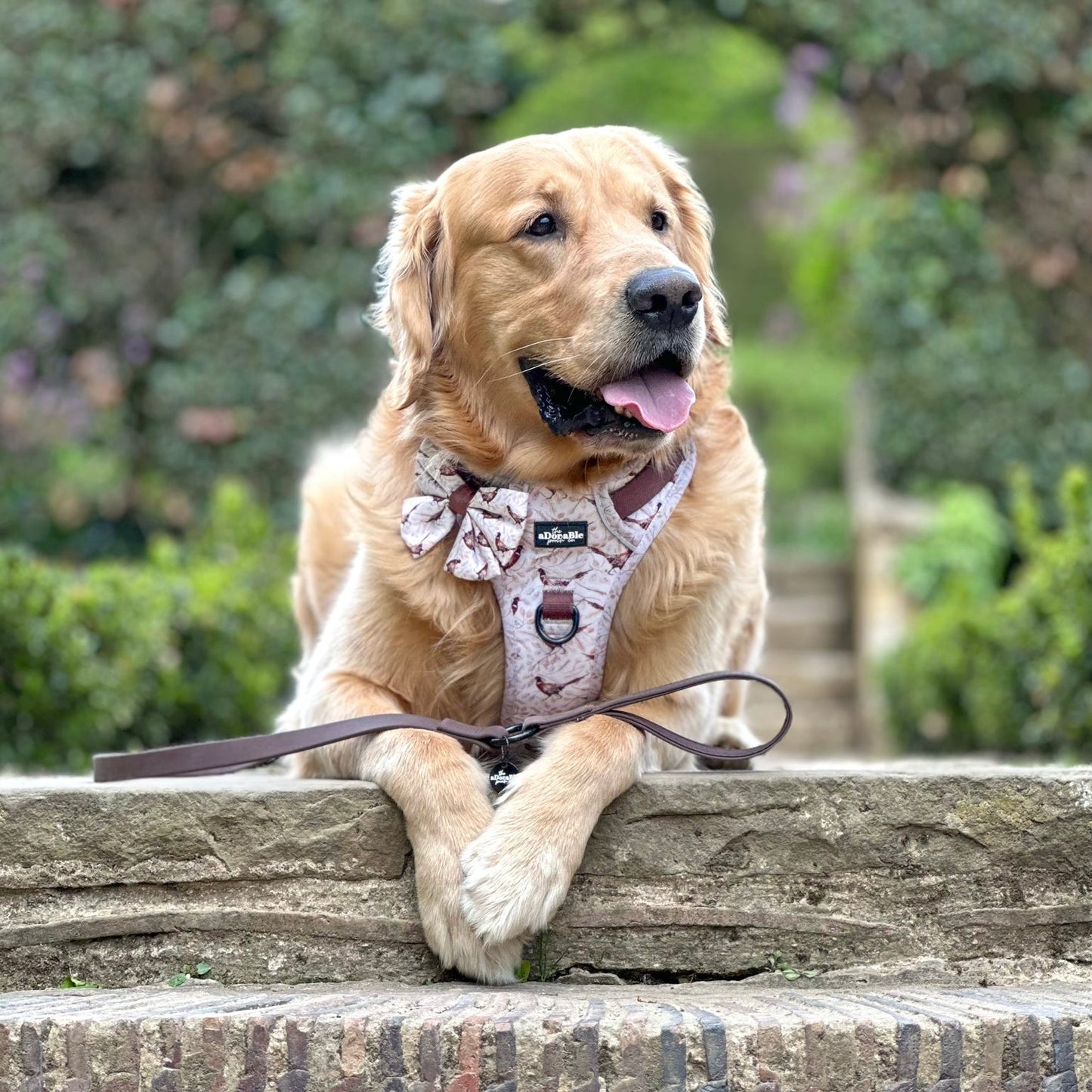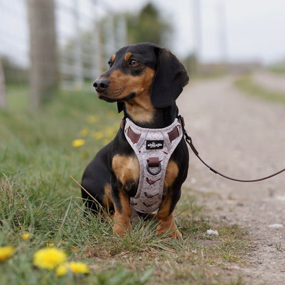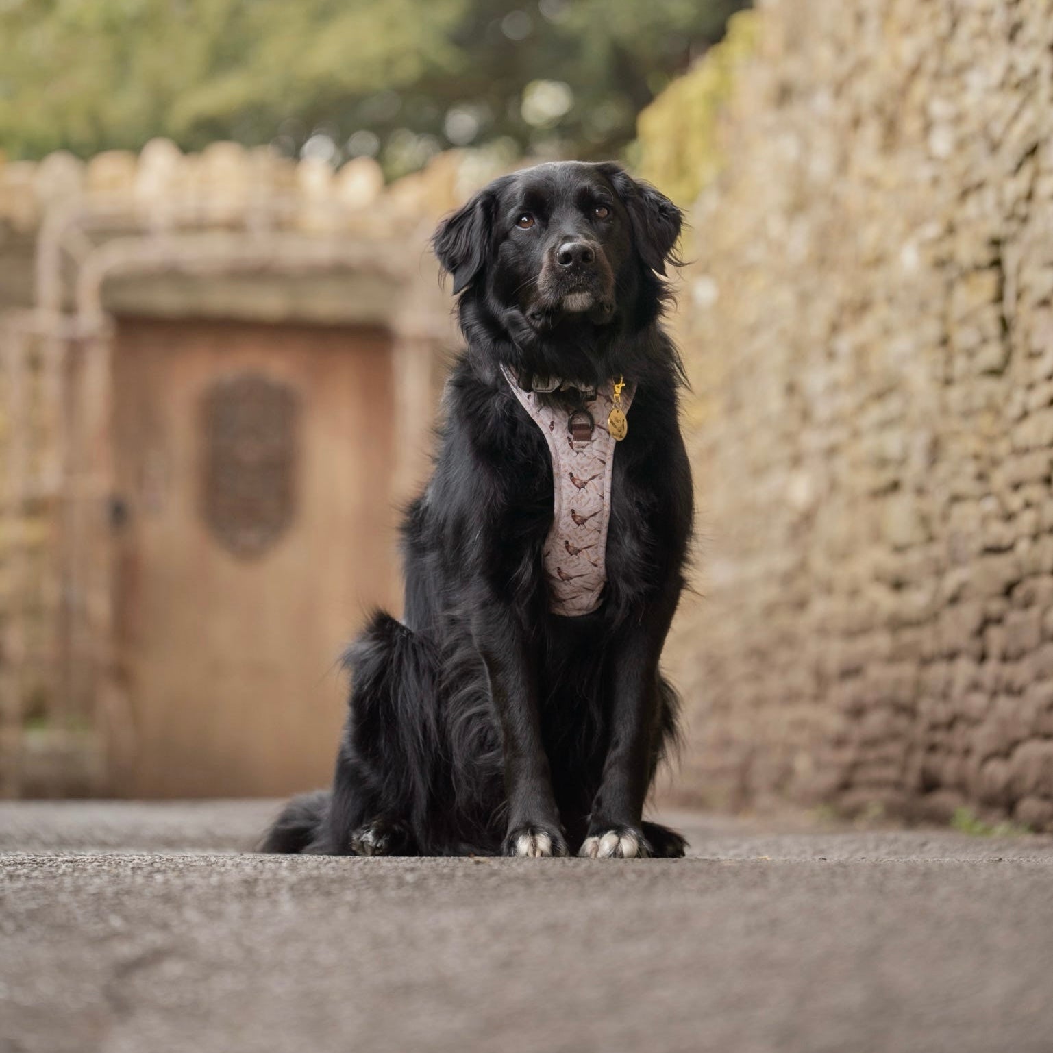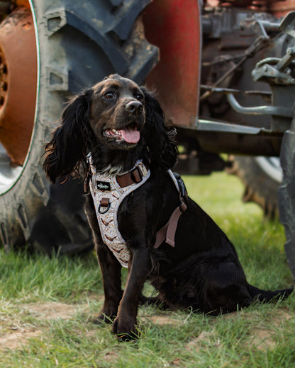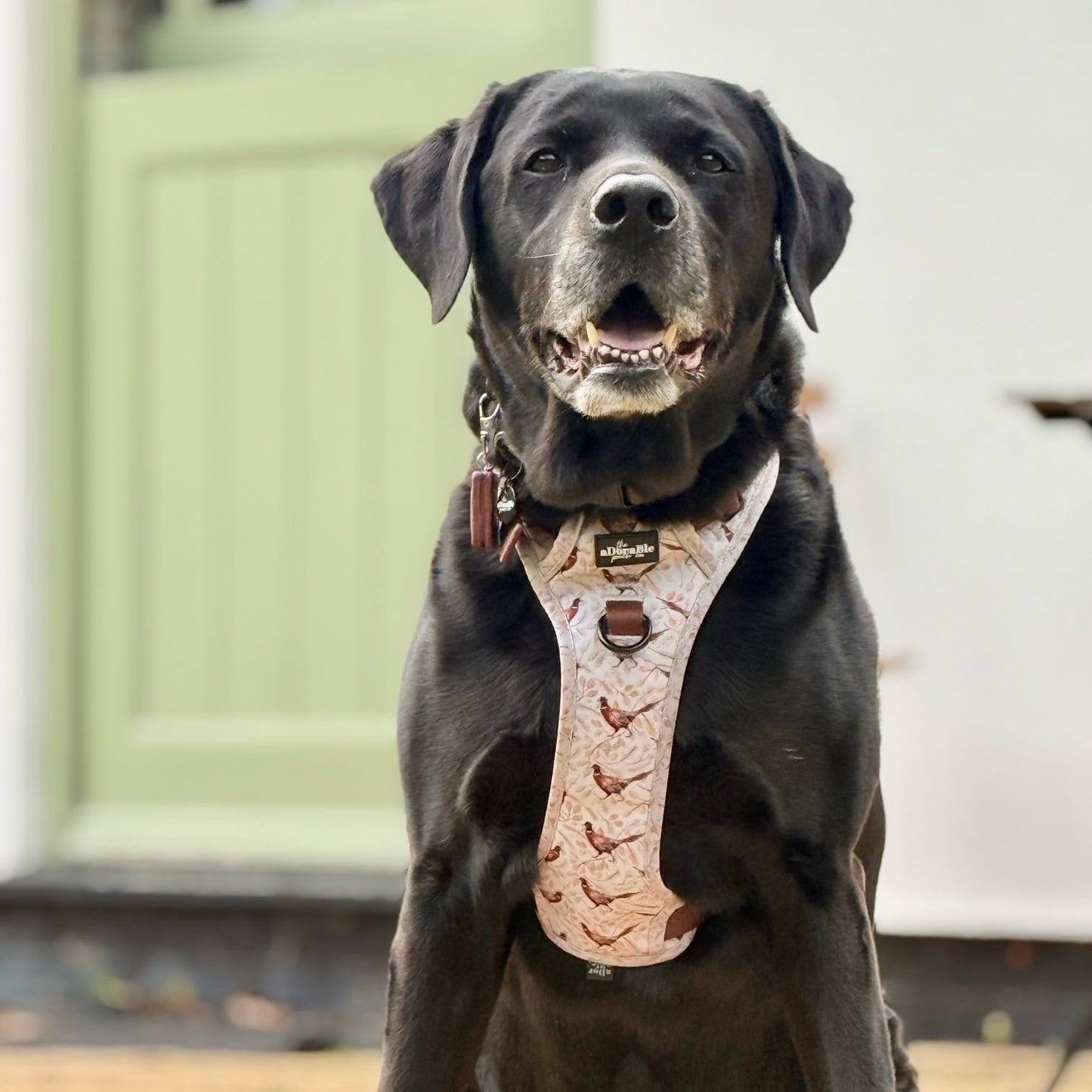 Set on a neutral beige background with subtle wheat field details, paired with rich, dark brown straps that harmonise beautifully with the hand-painted pheasant design. Every harness has been carefully designed with placement in mind, so each pheasant sits perfectly centred, adding just the right amount of detail. If you love hiking with your pooch, this collection is definitely for you!