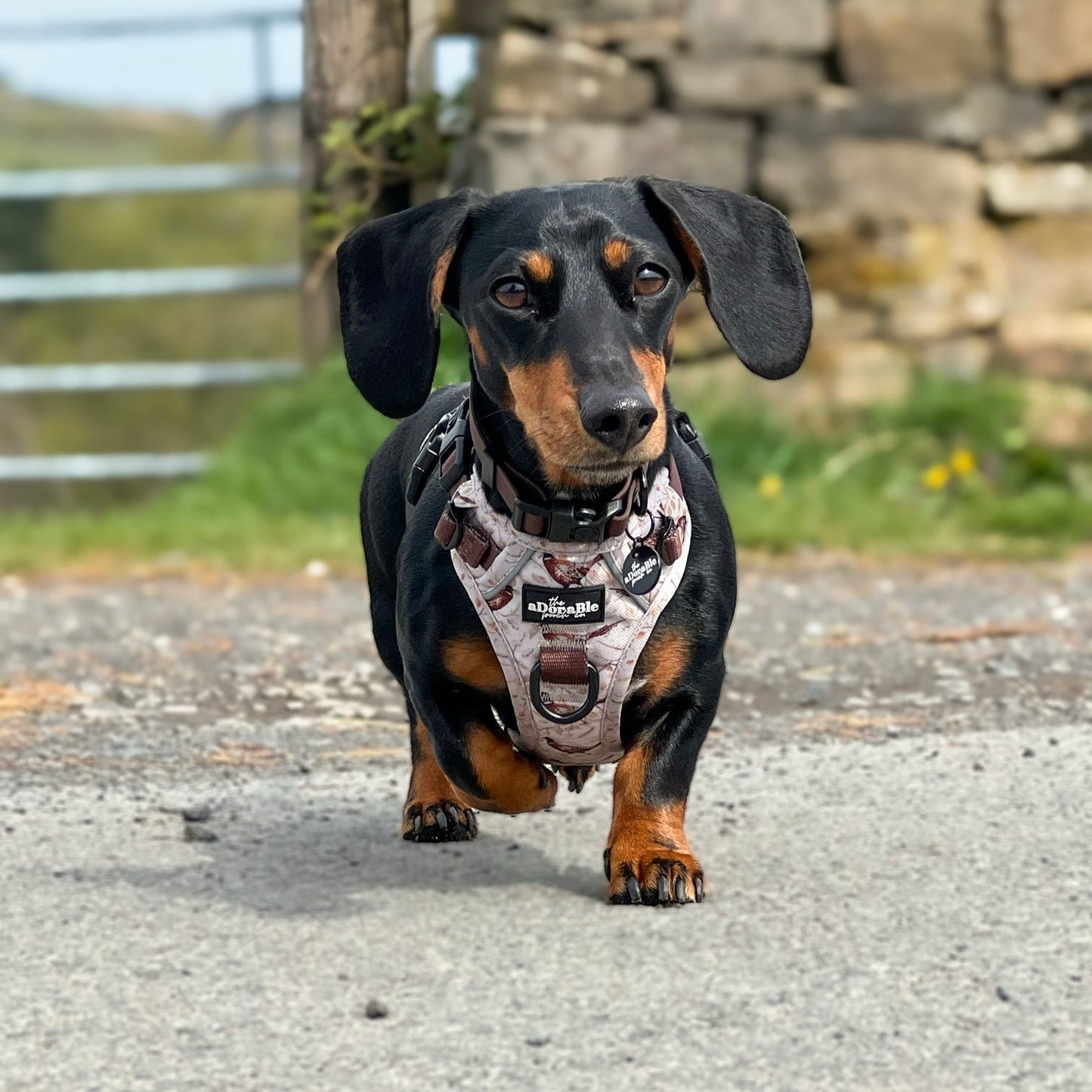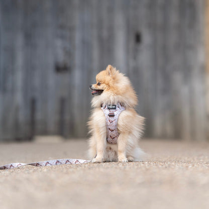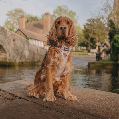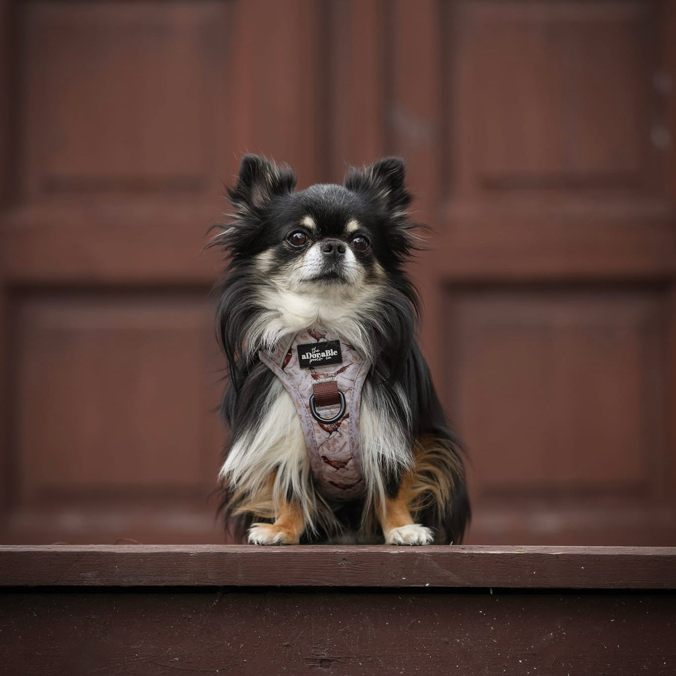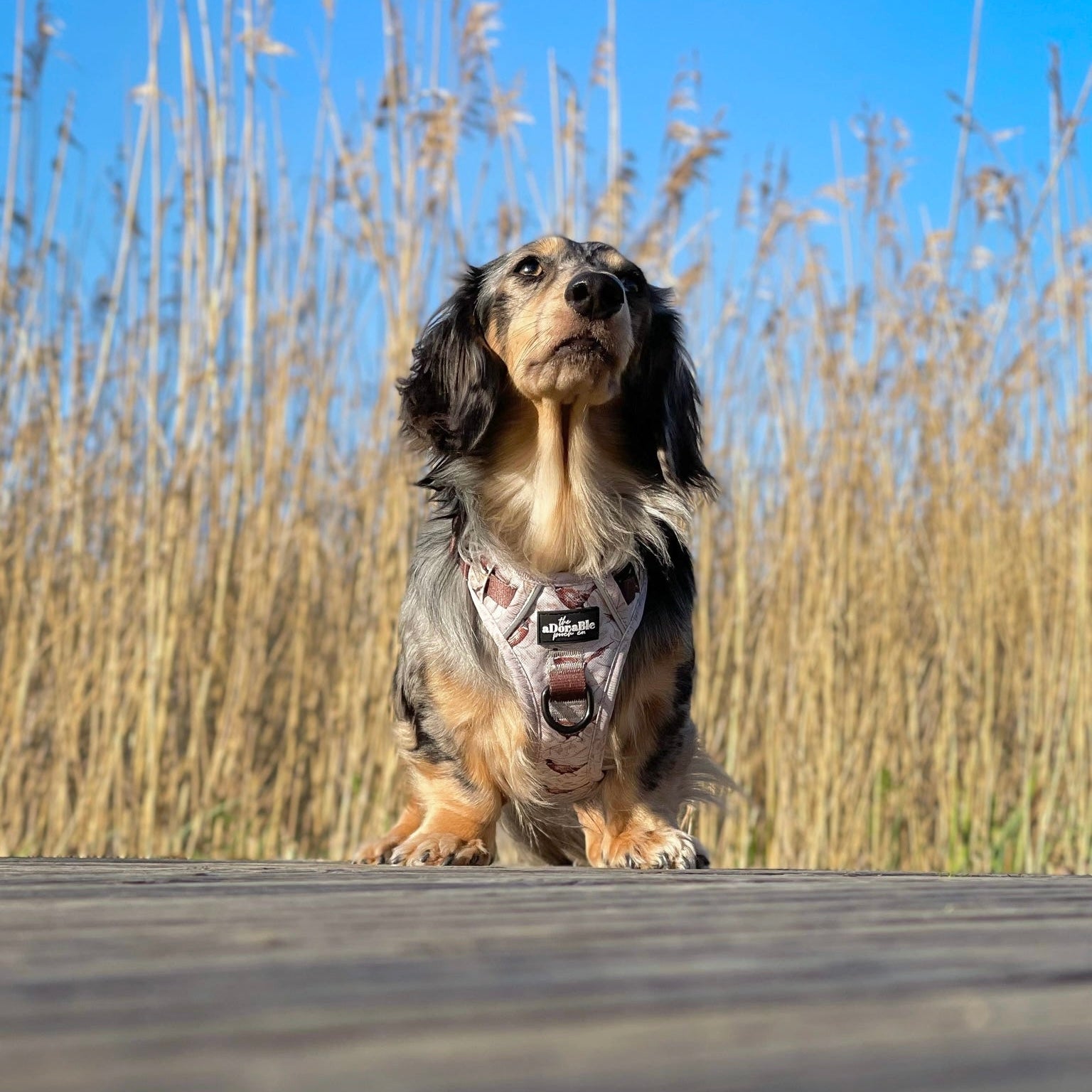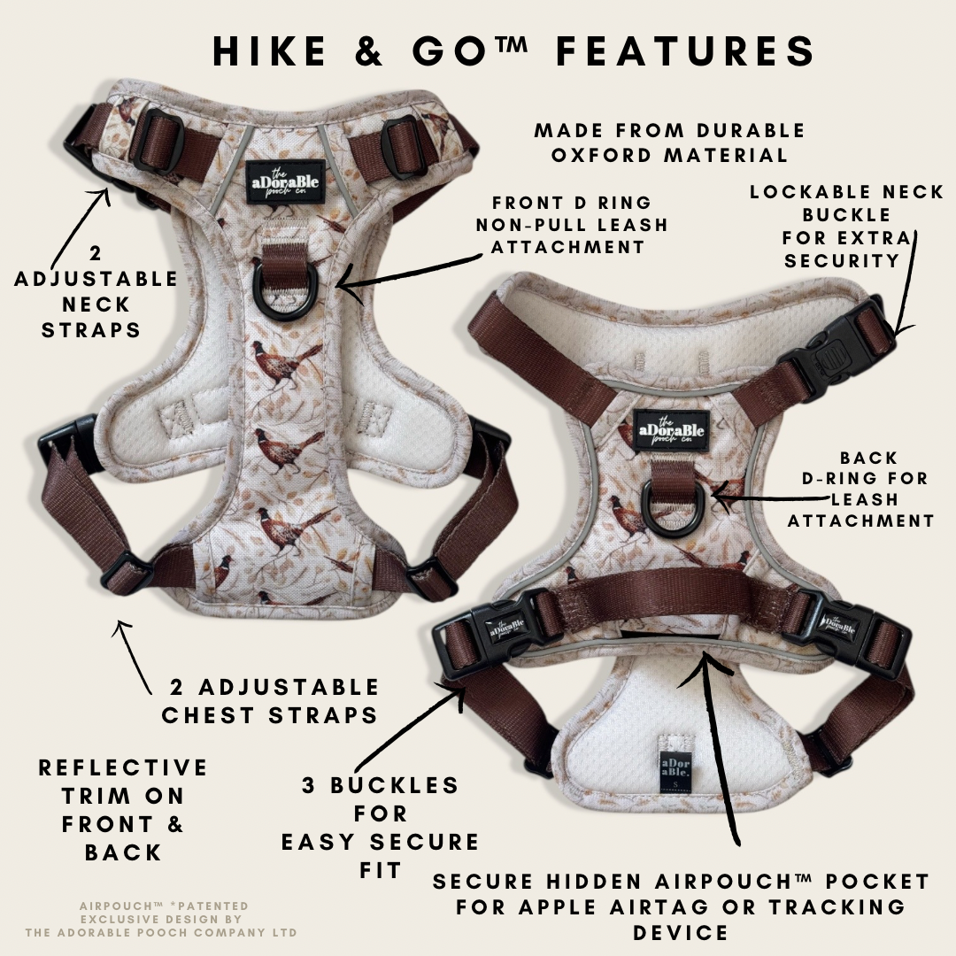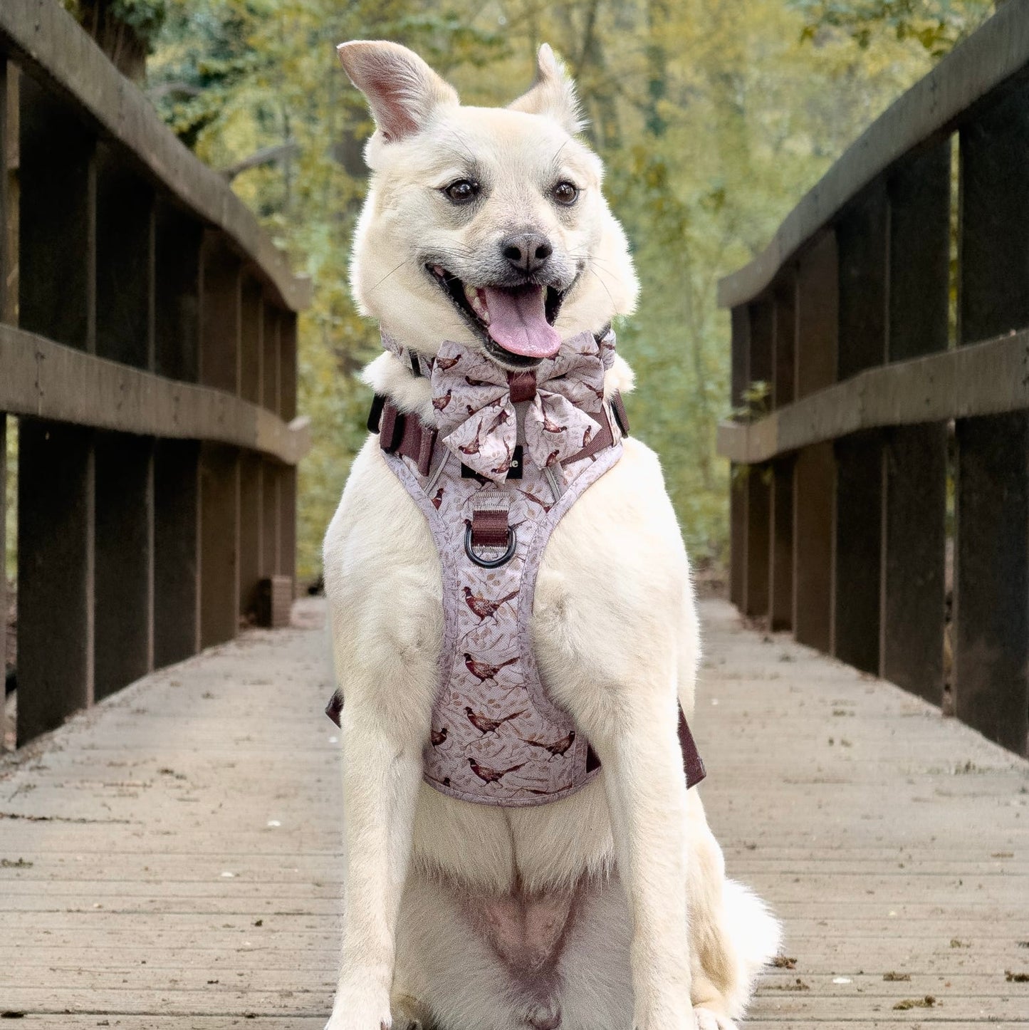 Set on a neutral beige background with subtle wheat field details, paired with rich, dark brown straps that harmonise beautifully with the hand-painted pheasant design. Every harness has been carefully designed with placement in mind, so each pheasant sits perfectly centred, adding just the right amount of detail. If you love hiking with your pooch, this collection is definitely for you!